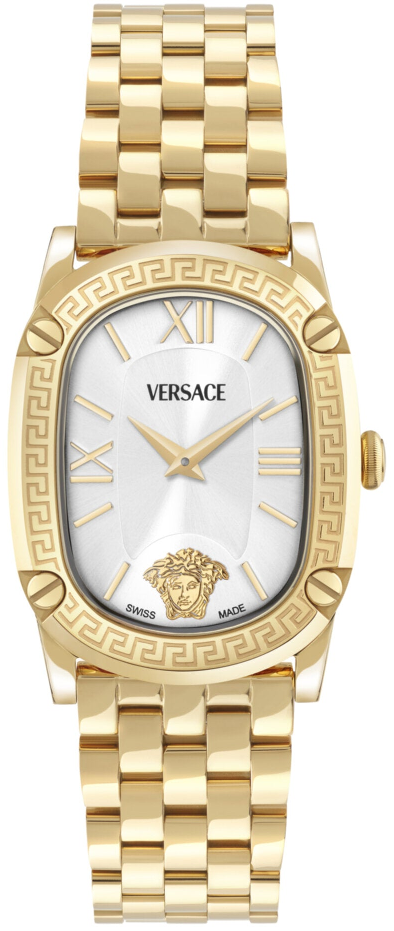 Bộ sưu tập Versace Couture định nghĩa lại vẻ quyến rũ vượt thời gian với vỏ hình bầu dục tinh tế và kiểu dáng thanh lịch 40x29mm. Điểm nhấn là biểu tượng Medusa ở vị trí 6 giờ và được bao quanh bởi vòng bezel Greca, chiếc đồng hồ này là sự thể hiện táo bạo di sản thời trang cao cấp của Versace. Vỏ vàng IP 29x40mm. Dây đeo vàng IP. Mặt số trắng chải tia. Chống nước 3 ATM. Khóa gập. Bộ máy thạch anh 2 kim sản xuất tại Thụy Sĩ.