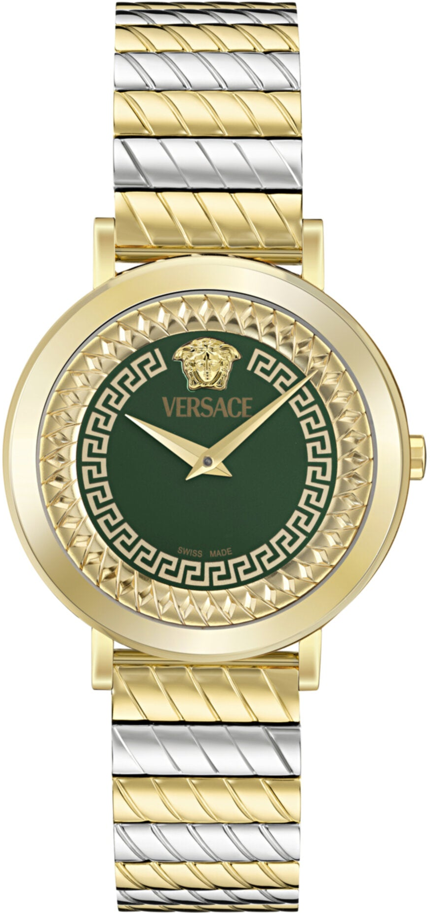 Bộ sưu tập này kết hợp giữa di sản và hiện đại. Vỏ đồng hồ mang tính biểu tượng phản ánh họa tiết phụ kiện của Versace, với dây xích chạy dọc vòng trong, tạo chiều sâu thú vị cho mặt số, cùng với họa tiết Greca trên mặt số. Càng đồng hồ được bao quanh bởi logo Versace, cùng với biểu tượng Medusa 3D nổi bật tại vị trí 12 giờ. Với dây xích được sử dụng trong các phụ kiện của Versace, chiếc đồng hồ này là hiện thân của vẻ đẹp thanh lịch vượt thời gian. Vỏ đồng hồ hai tông màu 35mm. Dây đeo hai tông màu. Mặt số xanh lá cây mờ. 5 ATM. Khóa Deployant. Bộ máy Quartz 2 kim sản xuất tại Thụy Sĩ.