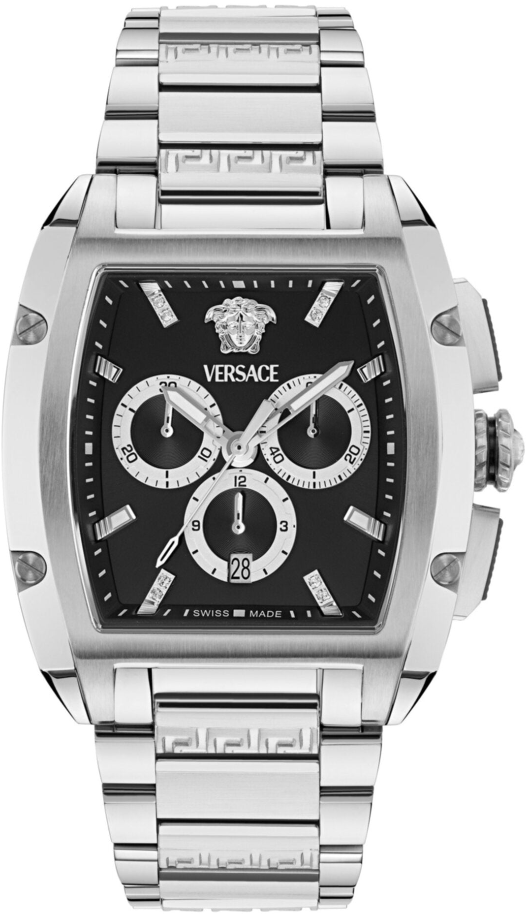 Theo xu hướng mới nhất, bộ sưu tập thể hiện ADN của Versace trong thiết kế vỏ hình thùng rượu táo bạo. Đồng hồ sở hữu bộ máy chronograph với 3 mặt số phụ. Vỏ thép không gỉ 42x50mm. Dây đeo thép không gỉ. Mặt số đen chải tia. Chống nước 5 ATM. Khóa gập. Bộ máy thạch anh chronograph, ngày. Sản xuất tại Thụy Sĩ.