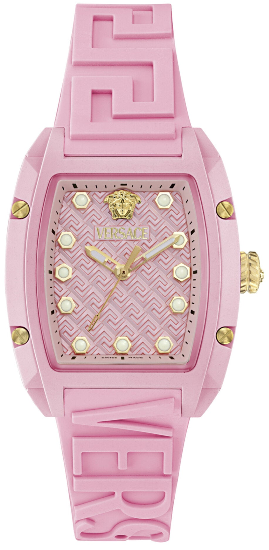 Bộ sưu tập Versace Superlight thể hiện sự tinh tế sang trọng, kết hợp phong cách biểu tượng của Versace với các vật liệu tiên tiến để tạo ra những chiếc đồng hồ vừa thời trang vừa thân thiện với môi trường. Mỗi chiếc đồng hồ trong bộ sưu tập này đều được thiết kế tỉ mỉ đến từng chi tiết, mang đậm dấu ấn thẩm mỹ đặc trưng của Versace kết hợp với những tiến bộ mới nhất trong công nghệ vật liệu. Bộ sưu tập mang đến nhiều kiểu dáng phù hợp với mọi sở thích và dịp. Cho dù bạn tham dự một sự kiện trang trọng hay tận hưởng một lối sống năng động, những chiếc đồng hồ này được thiết kế để dễ dàng nâng tầm diện mạo của bạn đồng thời giảm thiểu tác động đến môi trường. Bằng việc giới thiệu bộ sưu tập đột phá này, Versace tiếp tục vượt qua các giới hạn của ngành chế tác đồng hồ cao cấp, thiết lập các tiêu chuẩn mới về sự khéo léo, tính bền vững và phong cách. Vỏ gốm sinh thái màu hồng 36x44,8mm. Dây đeo gốm sinh thái màu hồng. Mặt số Guilloche màu hồng. Chống nước 5 ATM. Khóa Ardillon. Bộ máy thạch anh 3 kim sản xuất tại Thụy Sĩ.
