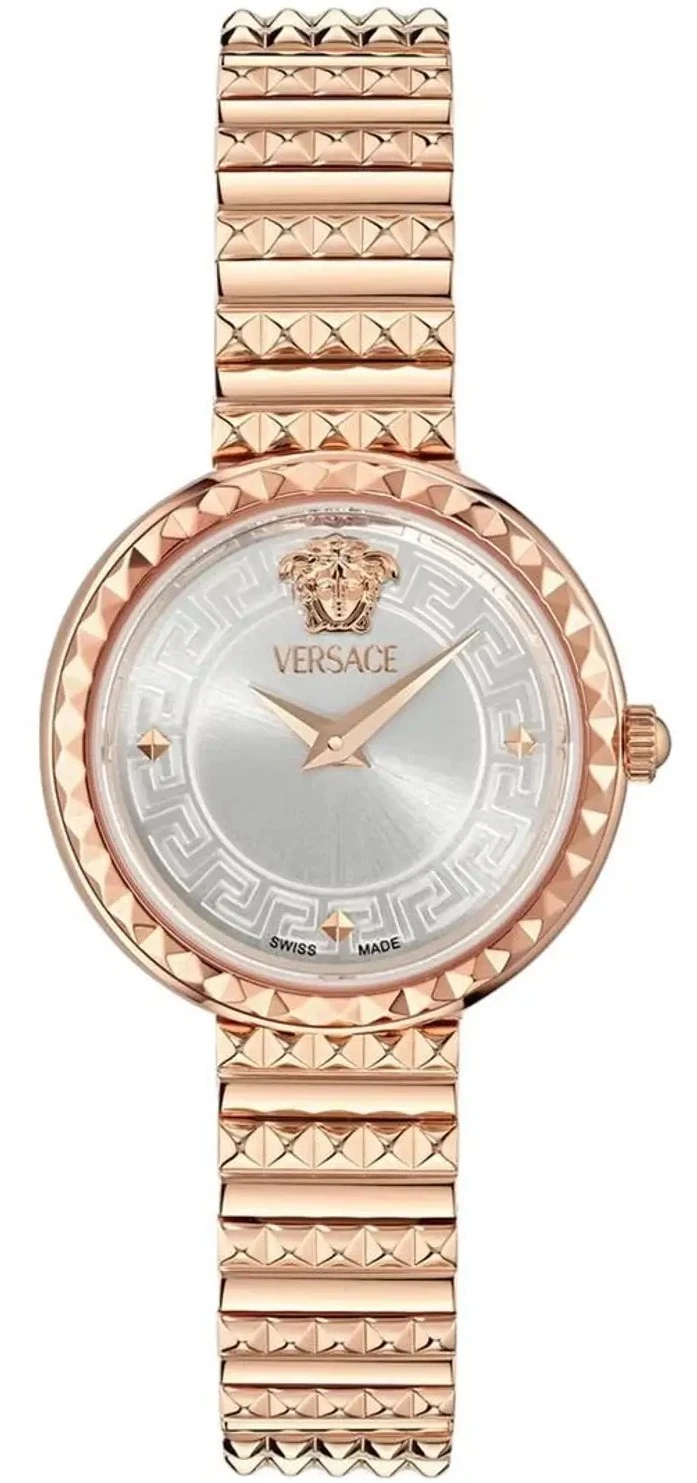 Vỏ và dây đeo bằng thép không gỉ mạ vàng hồng. Vòng bezel cố định bằng thép không gỉ mạ vàng hồng. Mặt số màu bạc với kim và vạch chỉ giờ mạ vàng hồng. Biểu tượng Medusa ở vị trí 12 giờ. Loại mặt số: Analog. Bộ máy quartz. Mặt kính sapphire chống trầy xước. Núm vặn kéo/đẩy. Nắp lưng kín. Hình dạng vỏ tròn, kích thước vỏ: 28 mm, độ dày vỏ: 7 mm. Chiều rộng dây đeo: 12 mm. Khóa bướm. Chống nước ở độ sâu 30 mét / 100 feet.