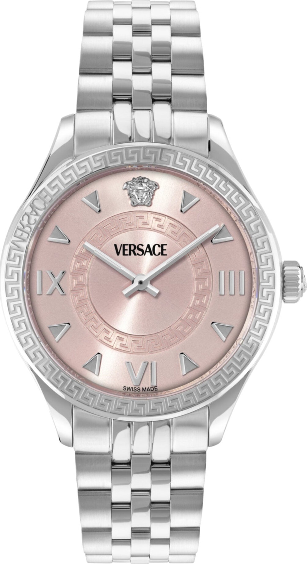 Vỏ thép không gỉ 35mm. Dây đeo thép không gỉ. Mặt số màu hồng chải tia. Chống nước 5 ATM. Khóa gập. Bộ máy thạch anh 2 kim sản xuất tại Thụy Sĩ.