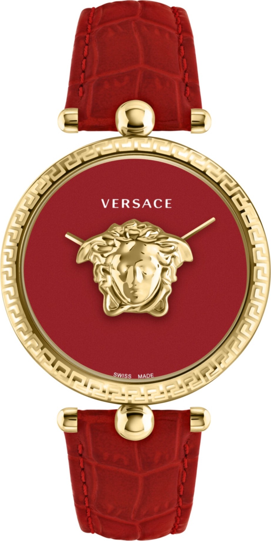 Nữ tính. Tinh tế. Sang trọng. Palazzo Empire là biểu tượng của đồng hồ Versace. Đầu Medusa 3D táo bạo, dường như lơ lửng phía trên trung tâm mặt số, được đặt giữa hai mặt kính đồng hồ, tô điểm và làm nổi bật mặt số chạm khắc guilloché. Vỏ vàng IP 39mm. Dây đeo da bê màu đỏ. Mặt số tráng men đỏ. Chống nước 5 ATM. Khóa Ardillon. Bộ máy thạch anh 2 kim sản xuất tại Thụy Sĩ.