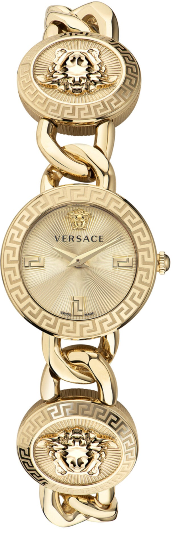 Chiếc đồng hồ trang sức thanh lịch này nổi bật với thân vỏ 26mm nữ tính được tô điểm bằng biểu tượng Medusa 3D ở góc 12H. Vỏ đồng hồ nhỏ nhắn độc đáo này được tô điểm bằng họa tiết La Greca khắc laser trên vòng trên cùng và dây đeo trang sức với biểu tượng Medusa 3D nổi bật ở góc 12H và 6H. Vỏ vàng vàng IP 26mm. Dây đeo vàng vàng IP. Mặt số vàng Sunray. Khóa trang sức 3 ATM. Bộ máy Quartz 2 kim sản xuất tại Thụy Sĩ.