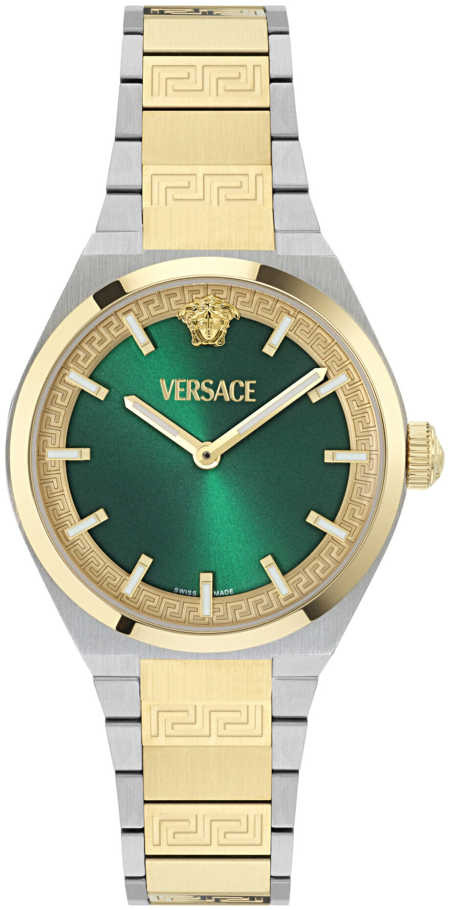 Vượt thời gian, thanh lịch và mang tính biểu tượng không thể phủ nhận—hãy cùng chiêm ngưỡng V-auria như một chiếc đồng hồ dành cho nữ. Vỏ đồng hồ 35mm bao bọc mặt số màu xanh lá cây rực rỡ với hiệu ứng tia nắng. Những chi tiết tinh tế mang đậm dấu ấn Versace tỏa sáng, từ vòng trong họa tiết Greca cùng tông màu đến đầu Medusa và logo ở vị trí 12 giờ, cùng các chi tiết Greca được khắc xen kẽ trên các mắt xích dọc theo dây đeo. Một hiện thân đích thực của sự sang trọng và tinh tế. Vỏ hai tông màu 35mm. Dây đeo hai tông màu. Mặt số màu xanh lá cây với hiệu ứng tia nắng. Chống nước 5 ATM. Khóa gập. Bộ máy thạch anh 2 kim sản xuất tại Thụy Sĩ.