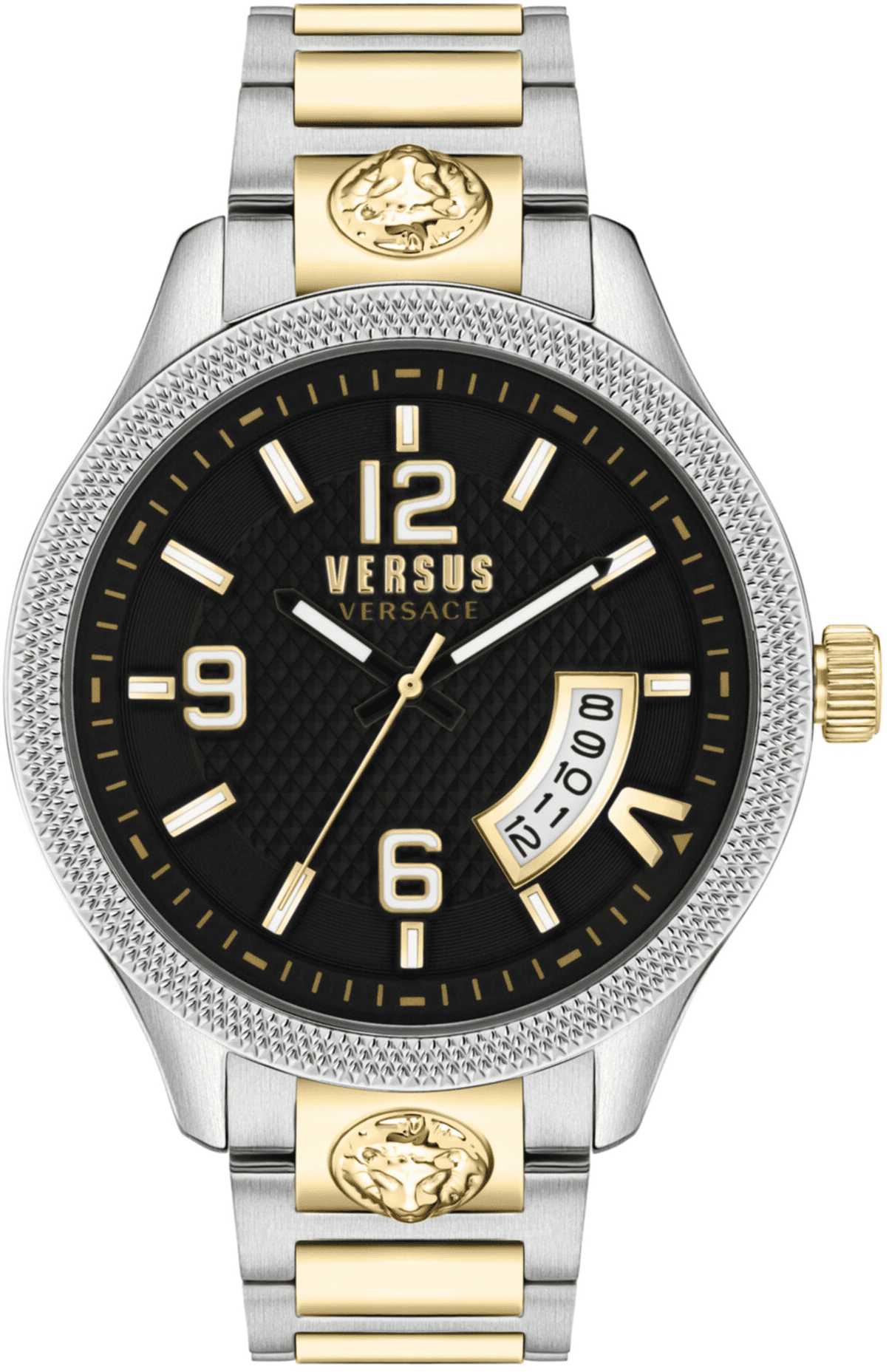 Versus Reale là một chiếc đồng hồ trẻ trung và thời trang với nhiều chi tiết gợi nhớ đến thương hiệu VERSUS Versace. Mặt số hình học nổi bật với cửa sổ hiển thị ngày lớn ở vị trí 4 giờ cùng với chữ “V” mạnh mẽ. Dây đeo được tô điểm bằng đầu sư tử 3D của VERSUS Versace ở vị trí 12 giờ và 6 giờ. Vỏ hai tông màu 44mm. Dây đeo hai tông màu. Mặt số tráng men đen. Chống nước 5 ATM. Khóa gập. Bộ máy thạch anh 3 kim hiển thị ngày.