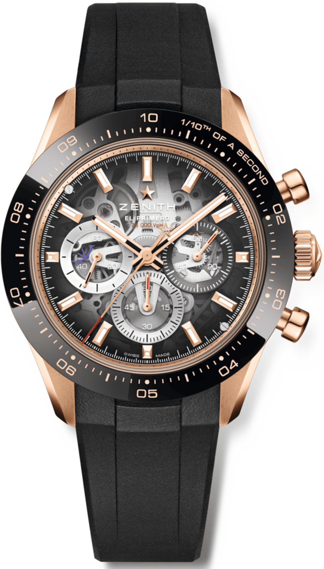 Mẫu đồng hồ CHRONOMASTER Sport Skeleton kết hợp vỏ vàng hồng 41mm với vành bezel gốm đen và dây đeo cao su đen. Mặt số sapphire chuyển màu nổi bật với các mặt số phụ ba màu chồng lên nhau đặc trưng của thương hiệu. Bên trong là bộ máy tự động El Primero 3600 SK được thiết kế dạng skeleton, một bộ máy chronograph tần số cao với chức năng chronograph 1/10 giây và khả năng dự trữ năng lượng 60 giờ. Bộ máy El Primero. Số linh kiện 311. Tần số 36.000 VpH (5 Hz). Khả năng dự trữ năng lượng khoảng 60 giờ. Giờ và phút ở trung tâm. Kim giây nhỏ ở vị trí 9 giờ. Chức năng chronograph 1/10 giây: Kim chronograph trung tâm quay một vòng trong 10 giây; bộ đếm 60 phút ở vị trí 6 giờ; bộ đếm 60 giây ở vị trí 3 giờ. Vỏ đồng hồ bằng vàng hồng 18 carat với viền gốm đen. Đường kính 41 mm. Khả năng chống nước 10 ATM. Mặt số sapphire màu với ba mặt số phụ có màu sắc khác nhau.