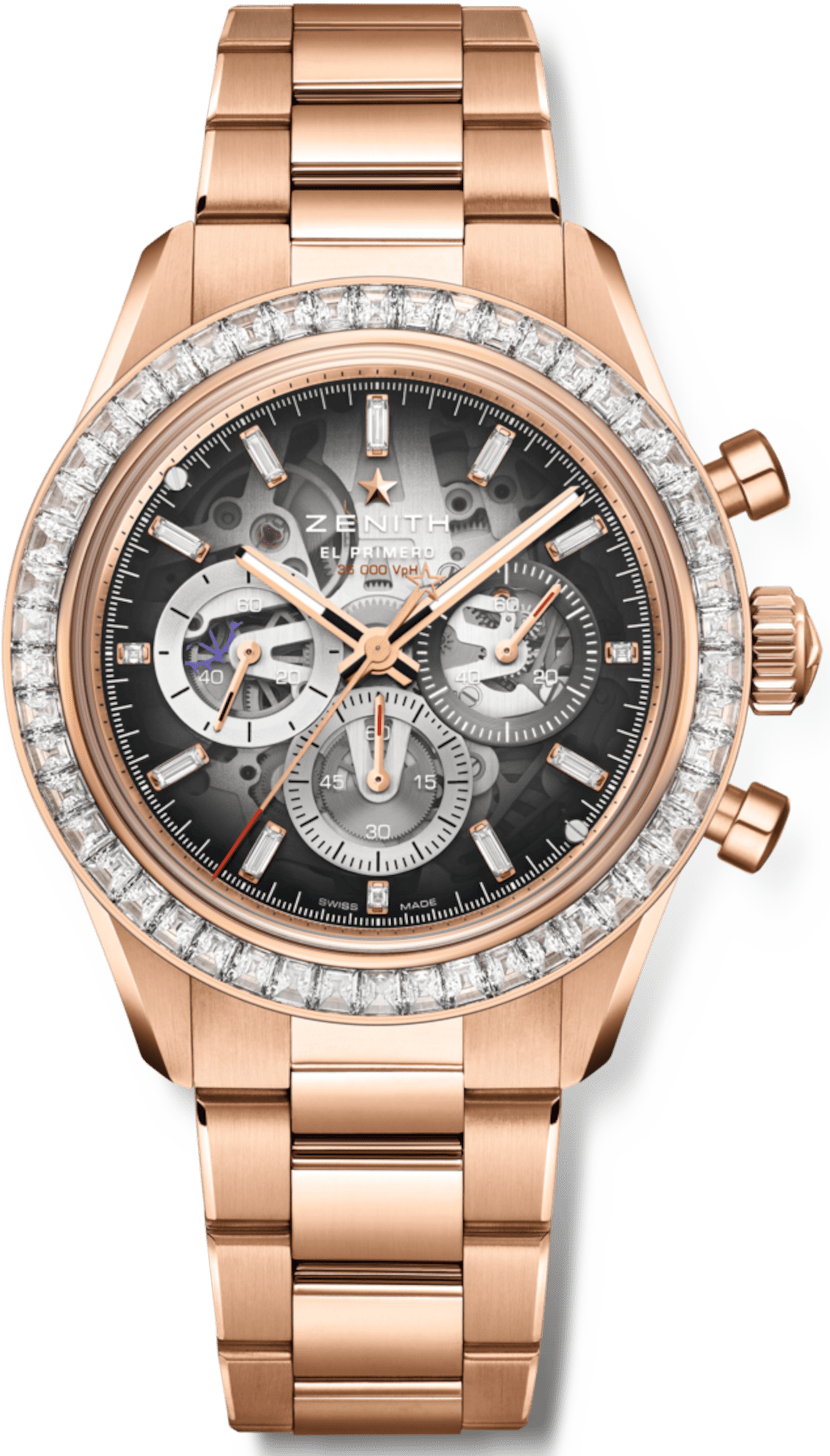 Đồng hồ CHRONOMASTER Sport Skeleton vỏ vàng hồng 41mm với 50 viên kim cương cắt baguette trên vành bezel. Mặt số sapphire hun khói với các mặt số phụ ba màu ở vị trí 3-6-9 trên bộ máy lộ máy: bộ máy tự động El Primero 3600 SK, một bộ máy tần số cao với chức năng bấm giờ 1/10 giây. Bao gồm một dây đeo vàng hồng với khóa gập điều chỉnh tinh tế và một dây đeo cao su đen dự phòng. Phiên bản giới hạn độc quyền 10 chiếc. Bộ máy El Primero. Số linh kiện 311. Tần số 36.000 VpH (5 Hz). Dự trữ năng lượng khoảng 60 giờ. Giờ và phút ở trung tâm. Kim giây nhỏ ở vị trí 9 giờ. Chức năng bấm giờ 1/10 giây: Kim bấm giờ trung tâm quay một vòng trong 10 giây; bộ đếm 60 phút ở vị trí 6 giờ; bộ đếm 60 giây ở vị trí 3 giờ. Chất liệu vỏ: Vàng hồng 18 carat. Đường kính: 41,00 mm. Khả năng chống nước: 10 ATM. Mặt số: Sapphire màu với ba mặt số phụ có màu sắc khác nhau.