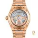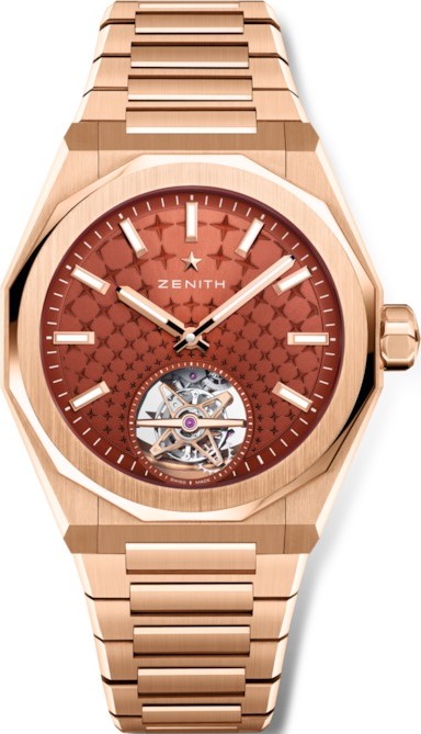 Đường chân trời rực sáng với phiên bản mới nhất của DEFY Skyline Tourbillon, được chế tác bằng vàng hồng lần đầu tiên. Với những đường nét tinh tế, táo bạo và kiến trúc tích hợp, chiếc đồng hồ quốc tế này tôn vinh di sản của ZENITH đồng thời thể hiện sự theo đuổi không ngừng nghỉ về độ chính xác kỹ thuật. Gợi nhớ đến tòa nhà lịch sử của Nhà sản xuất tại Le Locle, Thụy Sĩ, mặt số màu đỏ gạch được khắc những ngôi sao bốn cánh tỏa ra từ lỗ tourbillon. Con lắc dao động hình ngôi sao bằng vàng hồng được chế tác hở cho thấy thoáng qua chuyển động bên trong. Để có tính linh hoạt tối đa, hệ thống dây đeo thay đổi nhanh chóng của ZENITH có nghĩa là chiếc đồng hồ của bạn luôn theo kịp bạn trong thế giới chuyển động không ngừng này. Bộ máy El Primero 3630 mới đập ở tần số cao 5Hz (36'000 VpH) và được trang bị lồng tourbillon hở nhẹ (0,25g) với khả năng dự trữ năng lượng 60 giờ. Đồng hồ DEFY Skyline Tourbillon trong vỏ bát giác bằng vàng hồng 41mm với vành bezel nhiều mặt, có mặt số họa tiết bầu trời đầy sao tia nắng màu đỏ gạch tỏa ra từ tourbillon. Được cung cấp năng lượng bởi bộ máy tự động El Primero 3630, một tourbillon một phút tần số cao. Đi kèm với cả vòng đeo tay bằng vàng hồng và dây đeo cao su họa tiết màu đỏ gạch có thể dễ dàng thay đổi nhờ hệ thống thay dây đeo thông minh của chúng tôi. Bộ máy El Primero. Linh kiện 266. Tần số 36.000 VpH (5 Hz). Dự trữ năng lượng khoảng 60 giờ. Giờ và phút ở trung tâm. Tourbillon Buồng chuyển động được đặt ở vị trí 6 giờ; Nó quay một vòng mỗi phút; Lồng Tourbillon với 56 linh kiện. Chất liệu Vàng hồng 18 ct. Đường kính 41,00. Khả năng chống nước 10 ATM. mặt số Họa tiết bầu trời đầy sao tia nắng màu đỏ gạch.