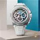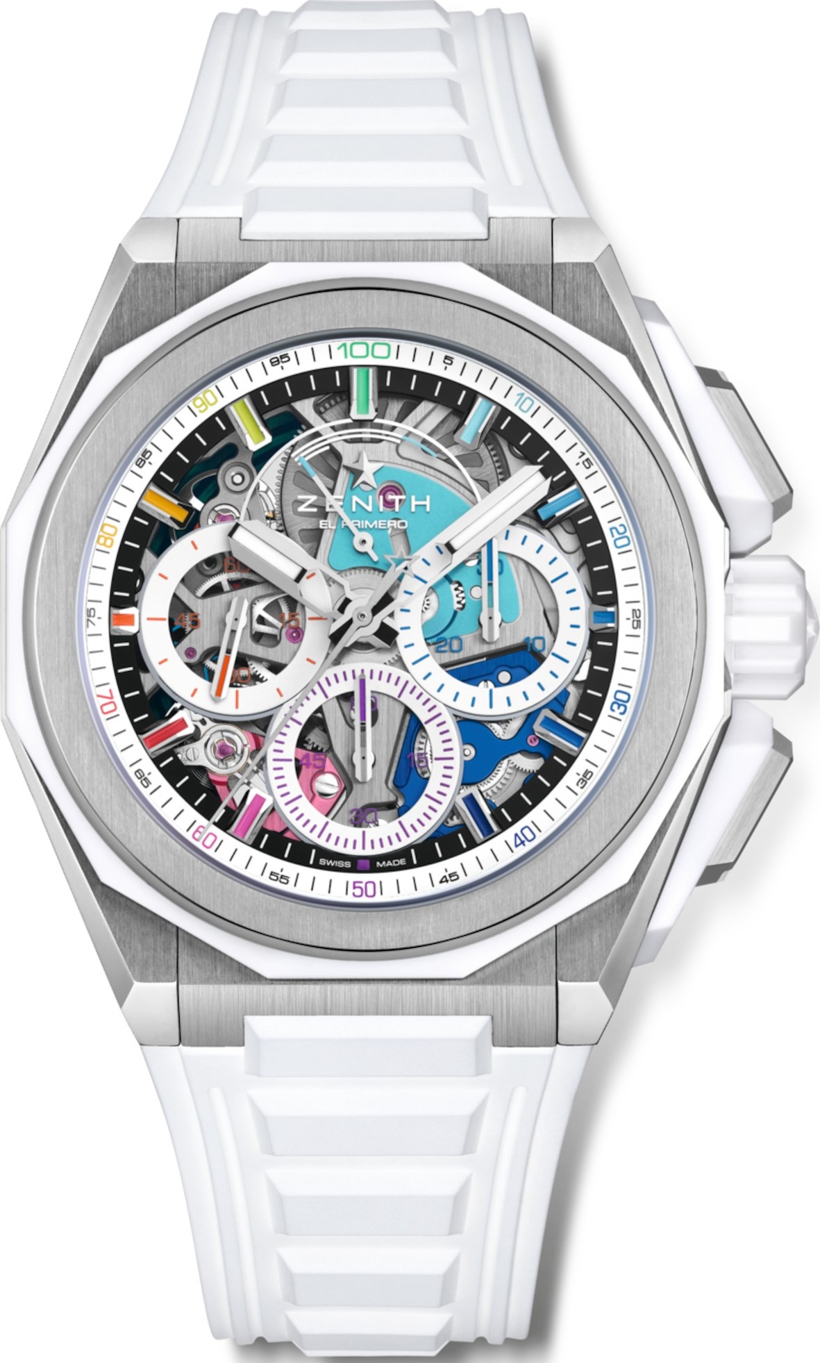Được chế tác bằng titan và gốm trắng, DEFY Extreme Chroma là phiên bản giới hạn 100 chiếc được nhấn mạnh bởi một phổ màu đặc biệt. Bộ máy tự động El Primero 9004 của nó có cấu trúc kép với bộ điều chỉnh đầu tiên hoạt động ở tần số 5 Hz để đảm bảo đo thời gian chính xác và bộ điều chỉnh thứ hai tích tắc ở tần số đáng kinh ngạc 50 Hz (360.000 vph) để điều khiển đồng hồ bấm giờ 1/100 giây. Được cung cấp với dây cao su màu trắng có khóa gấp, vòng đeo tay bằng titan và dây đeo Velcro màu đen. Bộ máy El Primero. Linh kiện 293. Tần số 36.000 VpH (5 Hz). Dự trữ năng lượng khoảng 50 giờ. Giờ và phút ở trung tâm. Giây nhỏ ở vị trí 9 giờ. Đồng hồ bấm giờ 1/100 giây: Kim bấm giờ trung tâm quay một vòng mỗi giây; bộ đếm 30 phút ở vị trí 3 giờ; bộ đếm 60 giây ở vị trí 6 giờ; Đồng hồ bấm giờ hiển thị mức dự trữ năng lượng ở vị trí 12 giờ. Chất liệu: Titan đánh bóng. Đường kính: 45,00. Khả năng chống nước: 20 ATM. Mặt số: Sapphire