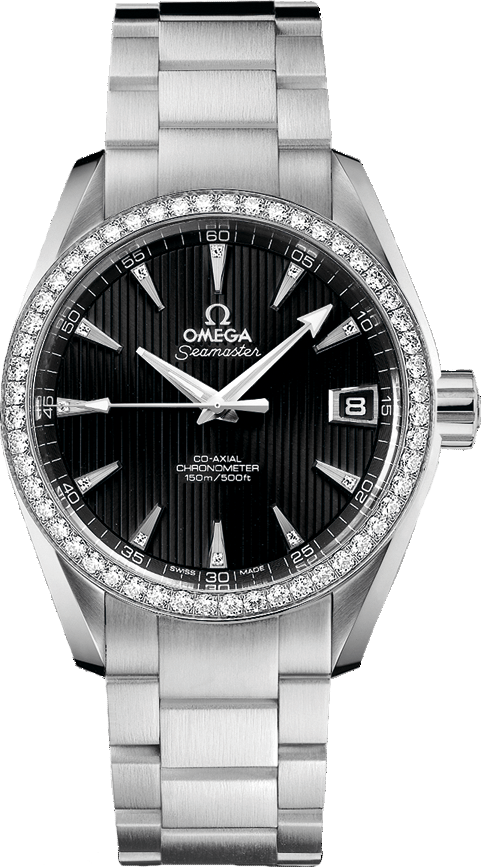 Chiếc đồng hồ cổ điển nhưng mạnh mẽ này là sự tôn vinh di sản hàng hải phong phú của OMEGA. Thiết kế mặt số ấn tượng và dễ nhận biết của bộ sưu tập OMEGA Seamaster Aqua Terra 150M gợi nhớ đến sàn gỗ của những chiếc thuyền buồm sang trọng. Mẫu đồng hồ này sở hữu mặt số màu đen với các vạch chỉ giờ nạm kim cương và cửa sổ hiển thị ngày ở vị trí 3 giờ. Mặt số Teak Concept có thể nhìn thấy qua mặt kính sapphire chống trầy xước. Vành bezel nạm kim cương được gắn trên vỏ thép không gỉ 38,5 mm cùng dây đeo bằng thép không gỉ. Chiếc đồng hồ này được trang bị bộ máy OMEGA Co-Axial calibre 8500, có thể nhìn thấy qua nắp lưng trong suốt. Khoảng cách giữa các vấu 19 mm. Khoảng cách từ vấu này đến vấu kia 45,50 mm. Đường kính vỏ 38,5 mm. Vỏ thép. Màu mặt số Đen. Mặt kính: Kính sapphire chống xước hình vòm, có lớp phủ chống phản quang ở cả hai mặt. Khả năng chống nước: 15 bar (150 mét / 500 feet). Kích thước đồng hồ: Nữ. Tổng trọng lượng sản phẩm (xấp xỉ): 143 g. Bộ máy: Omega 8500. Kiểu chuyển động: Tự động lên dây cót. Dự trữ năng lượng: 60 giờ