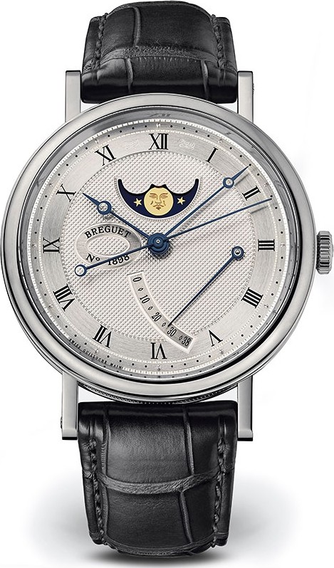 Đồng hồ đeo tay Classique bằng vàng hồng 18 cara. Chuyển động tự lên dây có đèn báo dự trữ năng lượng và các pha cũng như tuổi của mặt trăng. Cân bằng lò xo, đòn bẩy và bánh xe thoát hiểm bằng silicon. Mặt số tráng men grand feu màu trắng với chữ số Ả Rập Breguet và chữ ký bí mật. Vỏ sapphire. Chống nước ở độ sâu 3 bar (30 m). Đường kính: 39 mm. Cũng bằng vàng trắng với mặt số bằng vàng bạc.