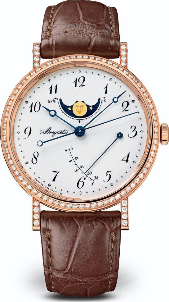 Đồng hồ đeo tay Classique bằng vàng hồng 18 cara. Viền và vấu được đính 96 viên kim cương, xấp xỉ. 0,768ct. Chuyển động tự lên dây có đèn báo dự trữ năng lượng và các pha cũng như tuổi của mặt trăng. Cân bằng lò xo, đòn bẩy và bánh xe thoát hiểm bằng silicon. Mặt số tráng men grand feu màu trắng với chữ số Ả Rập Breguet và chữ ký bí mật. Vỏ sapphire. Chống nước ở độ sâu 3 bar (30 m). Đường kính: 39 mm.