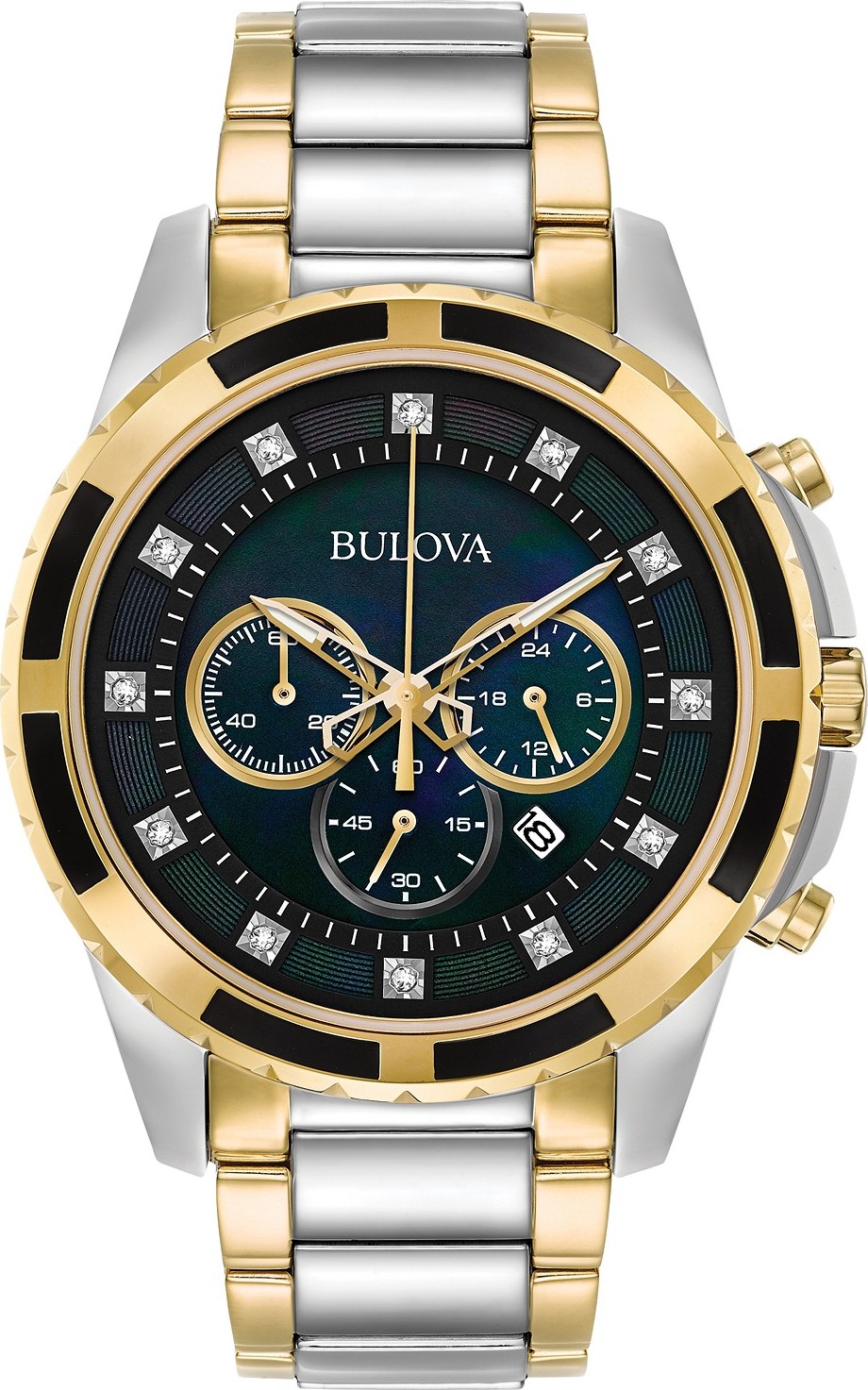Mặt số đồng hồ bấm giờ khảm xà cừ màu đen với các điểm nhấn bằng kim cương, ba kim màu vàng, ba mặt số phụ, cửa sổ ngày và logo Bulova