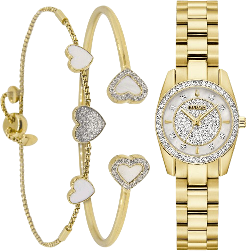Bộ sưu tập đồng hồ Bulova dành cho nữ này bao gồm một chiếc đồng hồ Crystal Collection và hai vòng đeo tay. Vỏ đồng hồ bằng thép không gỉ tông vàng với thiết kế thon gọn ôm sát cổ tay, được hoàn thiện chải xước và đánh bóng, điểm xuyết bằng 48 viên pha lê. Mặt số xà cừ nổi bật với các chi tiết mạ vàng, 8 vạch chỉ giờ bằng pha lê lấp lánh, và mặt số lát đá được tạo thành từ 102 viên pha lê được đính tỉ mỉ. Đồng hồ được hoàn thiện với dây đeo bằng thép không gỉ tông vàng đồng bộ cùng khóa cài. Đồng hồ còn đi kèm hai vòng đeo tay: một vòng đeo tay memory tone vàng tinh tế với mặt hình trái tim xà cừ được viền 36 viên pha lê, và một vòng đeo tay bolo chain tông vàng hiện đại, xen kẽ với những mặt hình trái tim xà cừ nhỏ và những mặt hình trái tim pha lê lát đá lớn hơn với tổng cộng 38 viên pha lê. Vừa đa năng vừa thời trang, bộ sưu tập đồng hồ Bulova dành cho nữ này có thể được đeo cùng lúc hoặc riêng lẻ, hoàn hảo để đồng hành cùng bạn hàng ngày. Màu sắc xà cừ trên mặt số có thể thay đổi tùy theo sự biến đổi tự nhiên của chất liệu. Phản xạ ánh sáng tạo ra hiệu ứng óng ánh, khiến màu sắc chuyển dịch và thay đổi, khiến mỗi mặt số trở nên độc đáo về màu sắc và tông màu. Công nghệ chuyển động 2039 Quartz Một chuyển động chạy bằng pin. Tinh thể thạch anh điều chỉnh thời gian đạt độ chính xác đến 15 giây một tháng. Chiều rộng vỏ (mm) 23,5. Chiều rộng càng (mm) 12. Trọng lượng (g) 65. Mặt số Trắng. Pha lê; Điểm nhấn tông vàng; Xà cừ; Điểm nhấn bạc. Pha lê; Logo âm thoa. Loại dây đeo: Vòng đeo tay Thép không gỉ. Chất liệu vỏ: Thép không gỉ tông vàng. Pha lê Vành bezel điểm nhấn pha lê. Khóa: Khóa gập. Pha lê tinh thể khoáng Chống va đập và vỡ. Chống nước 30M. Chức năng bổ sung: 3 kim