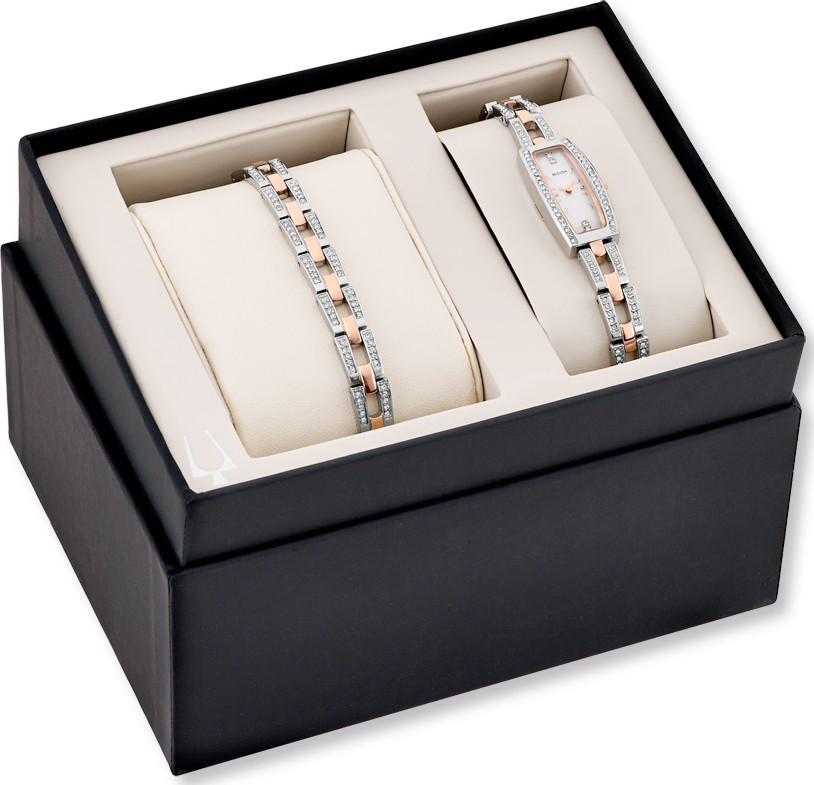 Vỏ thép không gỉ với bộ thép không gỉ hai tông màu với vòng đeo tay pha lê. Viền cố định. Mặt số xà cừ với kim màu vàng hồng và vạch chỉ giờ. Loại quay số: Analog. Chuyển động thạch anh. Tinh thể khoáng chống trầy xước. Kéo/đẩy vương miện. Vỏ sau chắc chắn. Đường kính vỏ: 15 x 30 mm. Độ dày vỏ: 7,5 mm. Hình dạng trường hợp hình chữ nhật. Móc cài trang sức. Chống nước ở độ sâu 30 mét / 100 feet. Chức năng: giờ, phút. Thông tin bổ sung: 196 tinh thể. Phong cách đồng hồ đeo tay. Đồng hồ đeo tay nữ hai tông màu Bulova Crystal Mother Of Pearl Dial 98X110.