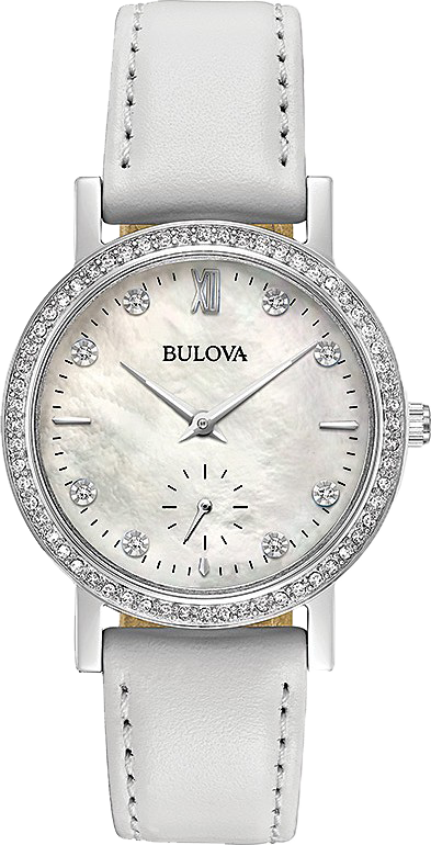 Từ Bộ sưu tập Pha lê dành cho Phụ nữ. Kiểu dáng thanh mảnh mới trong vỏ thép không gỉ được trang trí bằng 68 viên pha lê Swarovski trên viền và mặt số xà cừ trắng, mặt số phụ quét giây, dây đeo bằng da màu trắng với khóa 3 mảnh và khả năng chống nước ở độ sâu 30 mét.