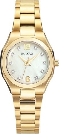 Đồng hồ Bulova dành cho nữ này được làm từ mạ vàng PVD và được cung cấp năng lượng bởi bộ chuyển động thạch anh tương tự. Nó được trang bị một vòng đeo tay bằng kim loại tông vàng và có mặt số bằng ngọc trai. Được đính 10 viên kim cương thật..
