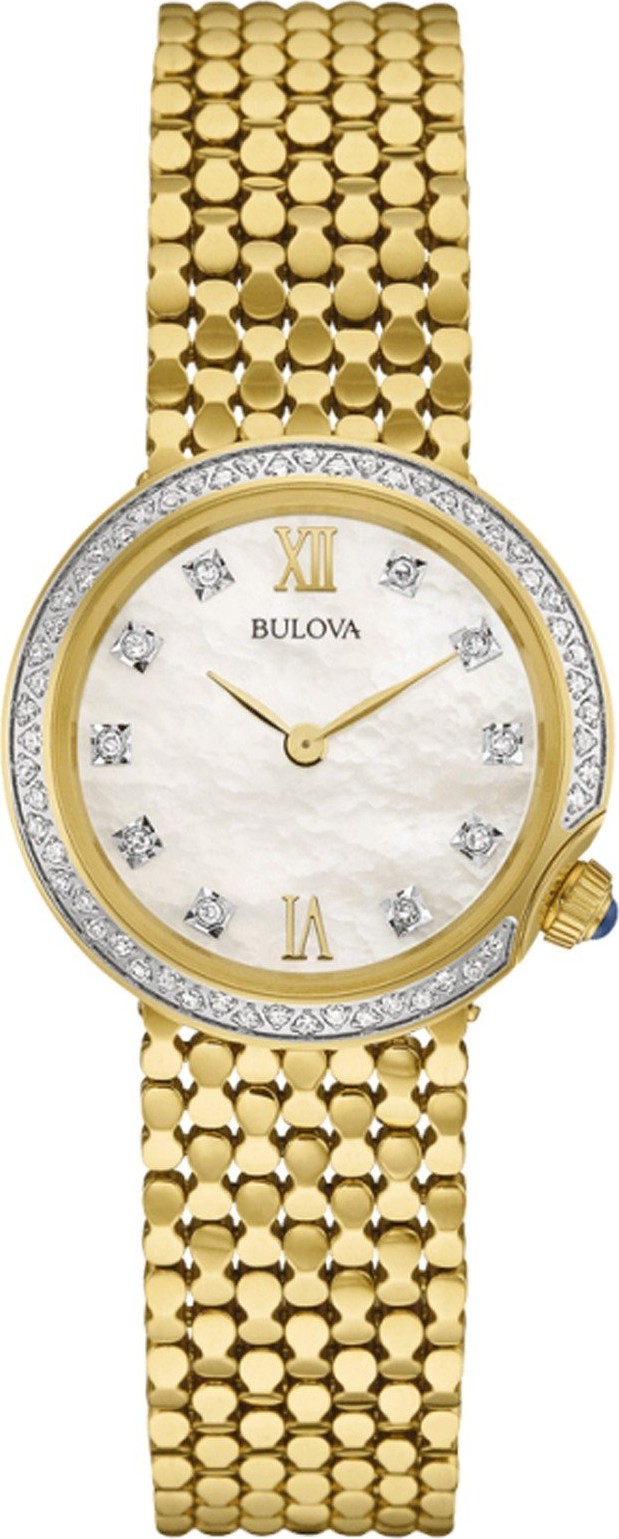 Vòng đeo tay tông vàng độc đáo càng làm tăng thêm vẻ đẹp nạm kim cương cho chiếc đồng hồ đặc biệt này của Bulova.