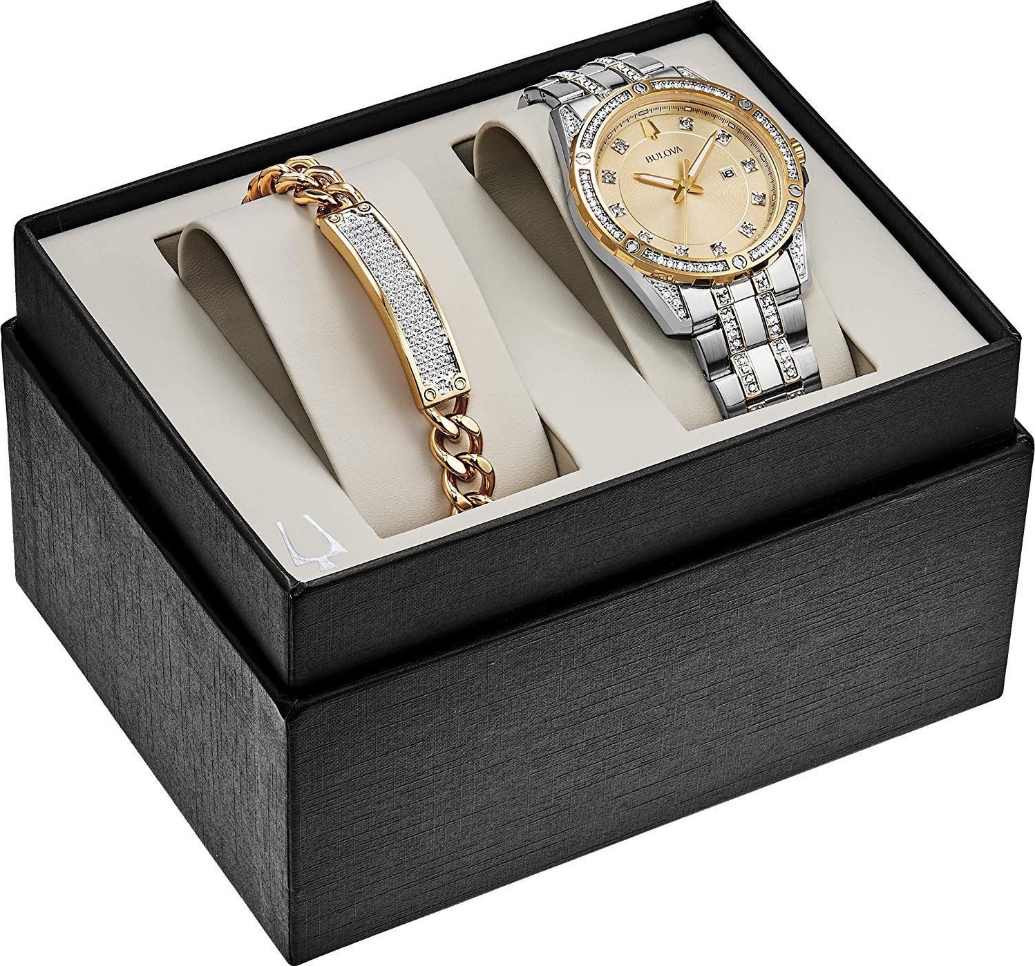 Đồng hồ bằng thép không gỉ và tông vàng và vòng đeo tay tông vàng phối hợp với bộ thẻ ID tỏa sáng với 225 Pha lê Swarovski