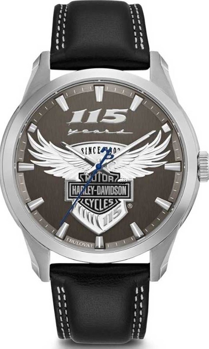 Đồng hồ Bulova nam Harley-Davidson® Phiên bản giới hạn kỷ niệm 115 năm, 76A160. Để Ngài kỷ niệm Lễ kỷ niệm mang tính biểu tượng của HD. Mặt đồng hồ màu đen mờ có vạch chỉ giờ tông màu bạc phủ dạ quang màu trắng. Huy chương Winged Bar & Shield và logo Kỷ niệm 115 năm HD®. Kim giây màu xanh với đối trọng HD® đặc trưng. Vỏ thép không gỉ. Dây đeo bằng da màu đen có khóa ba mảnh. Chống nước lên tới 50m/165ft.