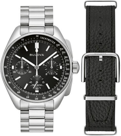 Vỏ và dây đeo bằng thép không gỉ tông màu bạc. Vành thép không gỉ tông màu bạc cố định. Mặt số màu đen với kim và vạch chỉ giờ tông màu bạc. Vạch chỉ phút xung quanh vành ngoài. Kiểu mặt số: Analog. Kim và vạch chỉ giờ phát quang. Chronograph - ba mặt số phụ hiển thị: 60 giây, 60 phút và 1/10 giây. Bộ máy thạch anh Bulova Calibre NP20. Mặt kính sapphire chống xước. Núm vặn kéo / đẩy. Nắp lưng chắc chắn. Hình dạng vỏ tròn, kích thước vỏ: 43,5 mm. Chiều rộng dây đeo: 20 mm. Triển khai bằng khóa bấm nút. Chống nước ở độ sâu 50 mét / 165 feet. Chức năng: chronograph, giờ, phút, giây. Dòng Lunar Pilot Archive. Phong cách đồng hồ thể thao.