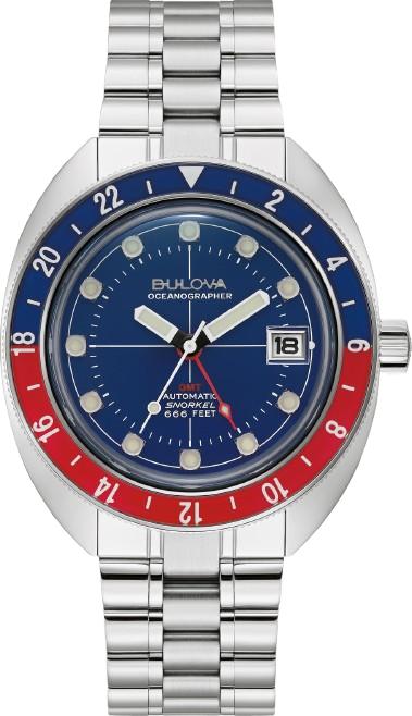 Với mẫu đồng hồ Oceanographer GMT dành cho nam mới, Bulova mang đến chức năng vượt trội cho một trong những thiết kế mang tính biểu tượng của hãng. Vỏ thép không gỉ có đường cong, mặt kính sapphire hình hộp, vành bezel xoay 24 giờ hai chiều màu xanh lam và đỏ, núm vặn vặn chặt cho khả năng chống nước ở độ sâu 200m. Mặt số màu xanh lam rực rỡ được tô điểm bởi những điểm nhấn màu đỏ tinh tế, với các vạch chỉ giờ phát quang, kim đồng hồ nổi bật với kim 24 giờ và sơn phát quang, cùng màn hình hiển thị ngày. Kim giờ được điều chỉnh độc lập giúp dễ dàng cài đặt giờ địa phương. Oceanographer GMT được trang bị bộ máy GMT tự động lên dây cót với 24 chân kính và khả năng dự trữ năng lượng 42 giờ, được bảo vệ bởi nắp lưng vặn chặt. Kết hợp với dây đeo năm mắt xích cùng khóa gập thể thao. Thiết kế cổ điển và dễ đeo, chiếc đồng hồ Bulova dành cho nam này luôn sẵn sàng đồng hành cùng bạn ở bất cứ đâu. Bộ máy 9075. Công nghệ Tự động. Được cung cấp năng lượng bởi lò xo lên dây cót, bộ máy cơ học không bao giờ cần pin. Bộ máy cơ học tự động có trọng lượng dao động giúp lên dây cót theo chuyển động của cánh tay người đeo. Chiều rộng vỏ (mm) 41. Chiều rộng càng (mm) 20. Trọng lượng (g) 161. Chất liệu vỏ: Thép không gỉ tông bạc. Pha lê: Tinh thể Sapphire cong kép