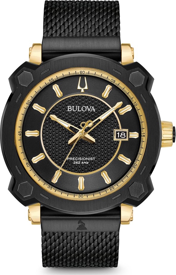 Phiên bản GRAMMY® đặc biệt từ Bộ sưu tập Precisionist. Vỏ thép không gỉ IP màu đen mờ, mặt số màu đen với các điểm nhấn tông vàng, tính năng lịch và kim giây quét, kính sapphire chống phản chiếu, vỏ vít có tem logo Grammy ở mặt sau, vòng đeo tay bằng thép không gỉ lưới IP màu đen với thao tác nhấn đúp đóng cửa và khả năng chống nước đến 100 mét. Được hỗ trợ bởi bộ chuyển động Precisionist tinh thể thạch anh ba nhánh độc quyền của Bulova với tần số rung 262kHz - lớn hơn tám lần so với đồng hồ thạch anh tiêu chuẩn - cho độ chính xác tuyệt vời.