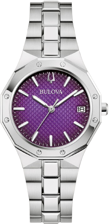 Thiết kế táo bạo, tinh tế là đặc điểm nổi bật của chiếc đồng hồ nữ Bulova Prestige cổ điển này, cân bằng giữa thiết kế táo bạo và vẻ ngoài thanh lịch. Đồng hồ sở hữu vỏ thép không gỉ tông bạc 32mm được mài cạnh với vành bezel hình học, mặt kính sapphire phẳng phủ lớp chống phản quang, khả năng chống nước 100m, dây đeo 3 mắt vát cạnh được hoàn thiện chải xước và đánh bóng, cùng khóa cài dạng bấm. Mặt số ombre màu tím đậm với họa tiết hình chữ thập, kim đồng hồ tông bạc và các vạch chỉ giờ được phủ lớp phát quang Super-LumiNova cùng màn hình hiển thị ngày. Nổi bật với vẻ hiện đại và tinh tế, chiếc đồng hồ nữ Bulova này là người bạn đồng hành lý tưởng trên mọi cổ tay. Bộ máy 2115. Công nghệ Quartz. Bộ máy chạy bằng pin. Tinh thể thạch anh điều chỉnh thời gian, đạt độ chính xác 15 giây mỗi tháng. Chiều rộng vỏ (mm) 32. Chiều rộng càng (mm) 18. Trọng lượng (g) 96. Mặt số màu tím bạc. Kim dạ quang. Kiểu dây đeo: Vòng đeo tay. Chất liệu vỏ: Bạc. Thép không gỉ. Trang trí bằng vít; Vỏ: Vít. Khóa: Khóa gập có nút bấm. Mặt kính: Sapphire chống phản quang. Chống va đập và vỡ - lớp phủ chống phản quang làm lệch hướng ánh sáng. Độ chống nước: 100M. Chức năng bổ sung: 3 kim, Lịch ngày