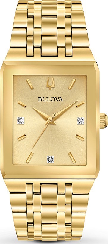 Giới thiệu một chiếc đồng hồ nam kiểu xe tăng mới từ Bộ sưu tập Hiện đại của Bulova, vỏ thép không gỉ tông vàng 30 x 45mm được phủ một lớp tinh thể khoáng kim loại hóa các cạnh trên cùng. Mặt số hình chữ nhật tông vàng có ba viên kim cương và cọc số tông vàng. Vòng đeo tay bằng thép không gỉ tông vàng được bảo vệ bằng khóa triển khai. Đồng hồ có khả năng chịu nước ở độ sâu 30 mét và có bộ máy thạch anh.