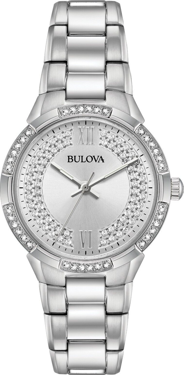 Thương hiệu Bulova. Sở Phụ Nữ. Loại Đồng hồ đeo tay. Số tham chiếu 96L249. Tùy chỉnh số Phong cách ăn mặc/trang trọng. Người mẫu Pha lê Bulova. Có mặt số 12 giờ, điểm nhấn pha lê. Phong trào: Quartz. Màu mặt số Bạc-Trắng. Màu dây Bạc. Màu viền Bạc. Màu vỏ Bạc. Chất liệu dây đeo Thép không gỉ. Hiển thị tương tự. Chất liệu vỏ thép không gỉ. Khả năng chống nước 30 m (3 ATM). Kích thước vỏ 30 mm. Đồng hồ hình tròn.