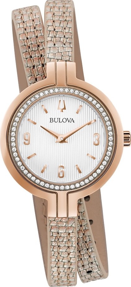 Đồng hồ đeo tay nữ dây da vàng Bulova Rhapsody kim cương trắng mặt số. Dây đeo đôi bằng da hoa hồng với kết cấu hạt thằn lằn, khóa đóng, tinh thể khoáng phẳng, khả năng chống nước ở độ sâu 30 mét.