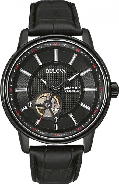 Đồng hồ tự động Bulova dành cho nam giới này có vỏ thép mạ ion màu đen và được cung cấp năng lượng bởi bộ chuyển động tự động tương tự. Nó được buộc chặt bằng dây đeo bằng da màu đen và có mặt số màu đen.