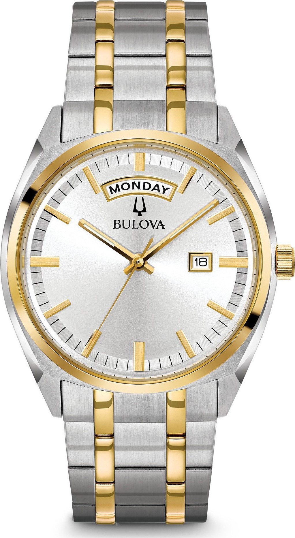 Vỏ thép không gỉ hai tông màu vàng với tính năng ngày/thứ ba kim mới, mặt số màu trắng bạc với kim và vạch chỉ giờ tông vàng, kính khoáng hình vòm, dây đeo bằng thép không gỉ và tông vàng với khóa đóng gấp đôi ngắn .