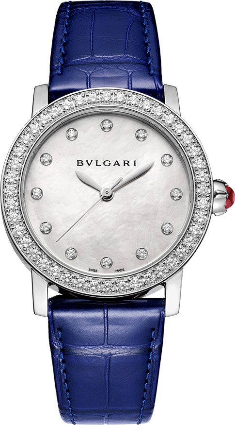 Vỏ thép không gỉ với dây đeo bằng da màu xanh (cá sấu). Bộ bezel cố định bằng thép không gỉ đính kim cương. Mặt số xà cừ với kim màu bạc và vạch chỉ giờ bằng kim cương. Loại quay số: Analog. Bộ chuyển động tự động Bvlgari calibre B77, dựa trên ETA 2892, chứa 21 viên Ngọc, hoạt động ở tần số 28800 vph và có khả năng dự trữ năng lượng khoảng 42 giờ. Tinh thể sapphire chống trầy xước. Vỏ sau chắc chắn. Hình dạng vỏ tròn. Kích thước vỏ: 33 mm. Tang kẹp. Chống nước ở độ sâu 30 mét / 100 feet.