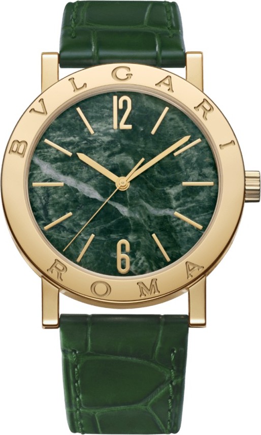 Phiên bản giới hạn kỷ niệm 50 năm bộ sưu tập mang tính biểu tượng, chiếc đồng hồ Bvlgari Bvlgari vượt thời gian với vỏ vàng vàng 18 kt là hiện thân của câu chuyện về sự sáng tạo táo bạo và phong cách Ý đặc biệt. Nổi tiếng với logo kép được khắc trên vành đồng hồ - một sự tôn vinh đối với những dòng chữ cong trên đồng xu La Mã cổ đại - chiếc đồng hồ huyền thoại này có logo Bvlgari Roma đặc biệt từ chiếc đồng hồ nguyên bản. Được trang bị bộ máy cơ tự động, mặt số bằng đá cẩm thạch xanh Verde Alpi, thể hiện sự tinh tế trong chế tác trang sức của Maison, kết hợp với dây đeo cá sấu xanh đậm. Một sáng tạo vượt thời gian và xu hướng, kết hợp giữa di sản và hiện đại. Đồng hồ Bvlgari Bvlgari với bộ máy cơ học do Bvlgari sản xuất, tự động lên dây cót, chức năng giờ và phút, bộ máy BVL 191 (dày 3,80 mm), tần số 28.800 VpH (4Hz) và dự trữ năng lượng 42 giờ. Vỏ và vành đồng hồ bằng vàng vàng 18 kt 38 mm khắc logo Bvlgari Roma, mặt số bằng đá cẩm thạch xanh Verde Alpi, kim mạ vàng vàng, nắp lưng được khắc họa tiết kỷ niệm 50 năm, núm vặn bằng vàng vàng 18 kt, dây đeo cá sấu xanh đậm và khóa cài bằng vàng vàng 18 kt. Khả năng chống nước lên đến 50 mét. Phiên bản giới hạn 150 chiếc. Đường kính (mm): 38. Hình dạng vỏ: Tròn. Chức năng: Giờ-Phút-Giây. Kiểu máy: Tự động. Chất liệu dây đeo: Da cá sấu. Dự trữ năng lượng: 42 giờ. Tần số: 28.800 VpH (4Hz). Khả năng chống nước: 50 m. Khóa: Khóa chốt. Chất liệu: Vàng vàng. Đá quý: Đá cẩm thạch. Màu sắc: Xanh lá cây. Sản xuất tại: Thụy Sĩ. Màu dây đeo: Xanh lá cây