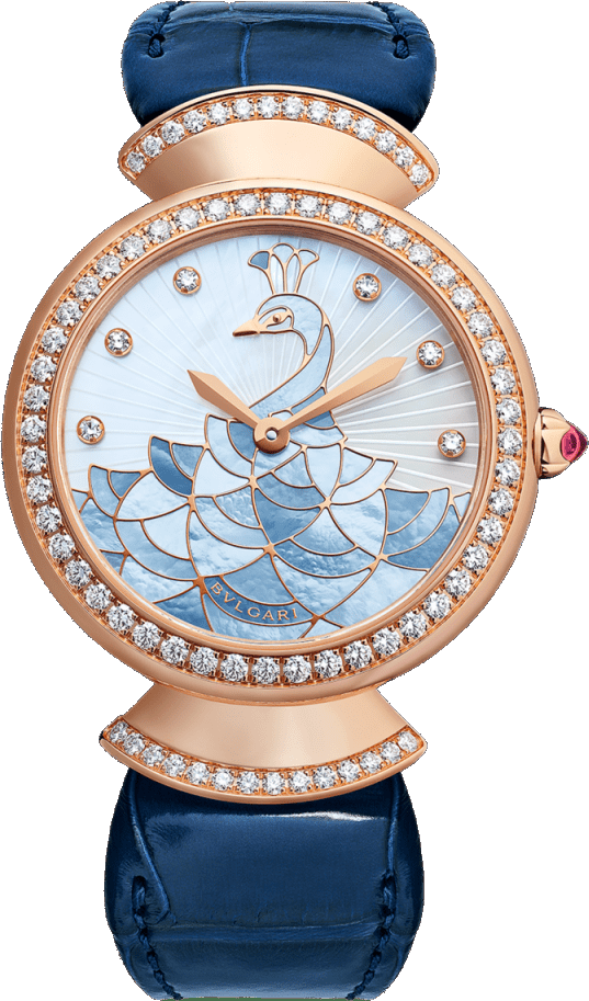 Sự kết hợp giữa sự sáng tạo đầy niềm vui và kỹ thuật chế tác trang sức bậc thầy, chiếc đồng hồ Divas' Dream bằng vàng hồng 18k thể hiện sự tinh thông của Bvlgari trong việc sử dụng đá quý và các kỹ thuật trang trí. Họa tiết hình quạt mang tính biểu tượng, bắt nguồn sâu xa từ di sản văn hóa của Rome, ôm trọn mặt số tinh tế với hình ảnh một con công tuyệt đẹp – nữ hoàng của thế giới tự nhiên – với chiếc đuôi lộng lẫy được chế tác khéo léo bằng các chi tiết xà cừ. Một dải kim cương pavé thanh lịch và dây đeo bằng da cá sấu màu xanh lam hoàn thiện mẫu đồng hồ này. Đồng hồ Divas' Dream với bộ máy thạch anh được tùy chỉnh với logo Bvlgari, chức năng hiển thị giờ và phút, vỏ vàng hồng 18k 37 mm, vành bezel vàng hồng 18k và các mắt xích hình quạt được đính kim cương cắt brilliant, núm vặn vàng hồng 18k đính đá tourmaline hồng cắt cabochon, mặt số hình con công với các chi tiết xà cừ, sáu vạch chỉ giờ đính kim cương, dây đeo bằng da cá sấu màu xanh lam và khóa ghim vàng hồng 18k. Chống nước đến 30 mét. Đường kính (mm): 33. Hình dạng vỏ: Tròn. Chức năng: Giờ-Phút. Loại máy: Thạch anh. Chất liệu dây đeo: Da cá sấu. Khả năng chống nước: 30 m. Số lượng chân kính: 1. Khóa: Khóa ghim. Chất liệu: Vàng hồng. Đá quý: Kim cương. Màu sắc: Trắng. Kích cỡ: M. Sản xuất tại: Thụy Sĩ. Màu dây đeo: Xanh dương.