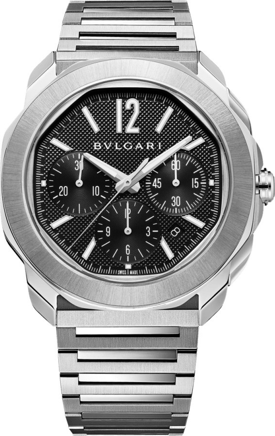 Với thiết kế vỏ bát giác tròn nhưng không hoàn toàn tròn đầy cuốn hút, đồng hồ Octo Roma Chronograph bằng thép không gỉ với dây đeo có thể thay thế là biểu tượng của phong cách đương đại, kết hợp cảm hứng La Mã với thẩm mỹ Ý và chuyên môn chế tác đồng hồ Thụy Sĩ. Bộ máy cơ tự động do hãng sản xuất cho phép theo dõi thời gian trôi qua với độ chính xác cao nhất, trong khi mặt số màu đen bóng bẩy giúp đọc giờ chronograph một cách trực quan. Hình thức, chức năng, thiết kế và tính tiện dụng hòa quyện thành một tổng thể mạch lạc và hài hòa. Đồng hồ Octo Roma Chronograph với bộ máy cơ tự sản xuất, lên dây tự động, hiển thị giờ, phút, giây trung tâm, ngày, chức năng chronograph, cỡ máy BVL399 và khả năng dự trữ năng lượng 42 giờ. Vỏ thép không gỉ 42 mm được chải mờ và đánh bóng, mặt số Clous de Paris màu đen, các vạch chỉ giờ và kim bằng kim loại được phủ Super-LumiNova®, ô hiển thị ngày ở vị trí 4:30, kim giây nhỏ ở vị trí 3 giờ, giờ chronograph ở vị trí 6 giờ và phút chronograph ở vị trí 9 giờ, núm vặn bằng thép không gỉ với hệ thống bảo vệ, và dây đeo bằng thép không gỉ được chải mờ và đánh bóng có thể thay thế. Chống nước đến 100 mét. Đường kính (mm): 42. Hình dạng vỏ: Bát giác. Chức năng: Đồng hồ bấm giờ, Ngày. Loại máy: Tự động. Chất liệu dây đeo: Thép không gỉ, Cao su. Khả năng chống nước: 100 m. Khóa: Khóa gập. Chất liệu: Thép. Màu sắc: Đen. Sản xuất tại: Thụy Sĩ. Màu dây đeo: Đen, Bạc