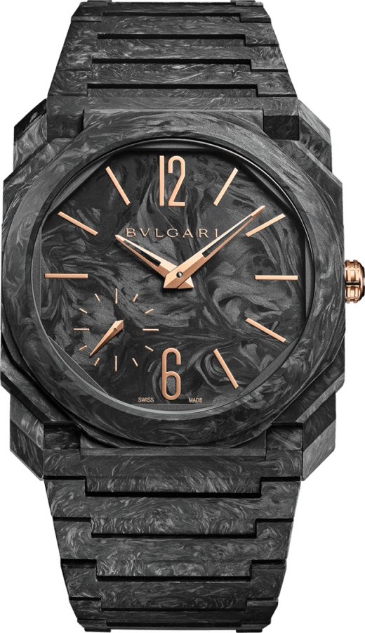 Sự kết hợp độc đáo giữa thiết kế Ý và chuyên môn chế tác đồng hồ Thụy Sĩ, đồng hồ Octo Finissimo CarbonGold Automatic kết hợp bộ máy siêu mỏng do hãng tự sản xuất với thẩm mỹ hiện đại táo bạo. Vỏ, dây đeo và mặt số được làm từ carbon màu than chì cực nhẹ với lớp hoàn thiện mờ, trong khi các chi tiết hiển thị và núm vặn, được chế tác bằng vàng hồng phát quang, tạo nên sự tương phản sang trọng trên nền công nghệ cao này. Đồng hồ Octo Finissimo CarbonGold Automatic với bộ máy cơ siêu mỏng do hãng tự sản xuất, lên dây tự động, cầu nối bằng vàng và rôto siêu nhỏ lệch tâm bằng bạch kim mạ vàng, hiển thị giờ, phút và giây nhỏ, cỡ máy BVL 138 (dày 2,23 mm), tần số 21.600 Vph (3Hz), 31 chân kính, dự trữ năng lượng 60 giờ. Vỏ carbon siêu mỏng 40 mm (dày 6,90 mm), mặt sau trong suốt, núm vặn bằng vàng hồng 18k được đánh bóng với lớp lót gốm đen, mặt số carbon, kim giây nhỏ, với kim và vạch chỉ giờ màu vàng, dây đeo carbon với khóa gập ba lưỡi. Chống nước đến 100 mét. Đường kính (mm): 40. Hình dạng vỏ: Bát giác. Chức năng: Giờ-Phút-Giây. Loại máy: Tự động. Chất liệu dây đeo: Carbon. Thời gian dự trữ năng lượng: 60 giờ. Tần số: 21.600 VpH (3Hz). Khả năng chống nước: 100 m. Khóa: Khóa gập. Chất liệu: Carbon. Màu sắc: Đen. Sản xuất tại: Thụy Sĩ