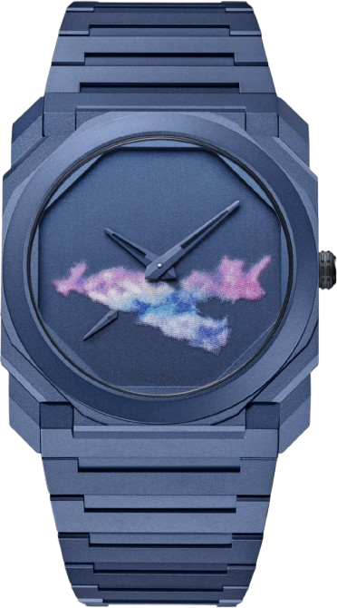 Một tác phẩm nghệ thuật đích thực, chiếc đồng hồ Octo Finissimo Laurent Grasso Phiên bản đặc biệt kết hợp giữa sự thanh mảnh tuyệt đối, thái độ cầu tiến và tính thẩm mỹ mang tính biểu tượng của vũ trụ Finissimo với tầm nhìn sáng tạo của nghệ sĩ ý niệm người Pháp. Với vẻ ngoài cực kỳ hấp dẫn bằng titan phủ PVD màu xanh, chiếc đồng hồ được làm sống động bởi mặt số bằng đồng thau có kỹ thuật in lụa 7 lớp với các sắc tố kim loại, giúp cân bằng hoàn hảo các sắc thái và ánh sáng độc đáo của vỏ và dây đeo. Đồng hồ Octo Finissimo Laurent Grasso Phiên bản đặc biệt với bộ máy cơ siêu mỏng, lên dây cót tự động, microrotor bạch kim, cỡ nòng BVL 138 (dày 2,23 mm) được trang trí thủ công bằng họa tiết Côtes de Genève, hoàn thiện vát cạnh và perlage, tần số 21'600 Vph (3Hz), dự trữ năng lượng 60 giờ. Vỏ titan 40 mm (dày 5,0 mm) và dây đeo phủ PVD xanh, mặt số bằng đồng thau cá nhân hóa với kỹ thuật in lụa 7 lớp của Laurent Grasso và sắc tố kim loại, kim đồng hồ bằng đồng thau phủ PVD xanh, núm vặn xoắn ốc titan-DLC đính miếng chèn gốm đen và nắp lưng trong suốt cá nhân hóa. Khả năng chống nước lên đến 30 mét. Phiên bản giới hạn 200 chiếc. Đường kính (mm): 40. Hình dạng vỏ: Bát giác. Chức năng: Kim giây nhỏ. Kiểu máy: Tự động. Chất liệu dây đeo: Titan. Dự trữ năng lượng: 60 giờ. Tần số: 21.600 VpH (3Hz). Khả năng chống nước: 30 m. Chất liệu: Titan. Màu sắc: Xanh dương. Sản xuất tại: Thụy Sĩ