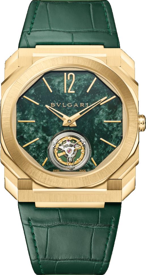 Thể hiện phong cách chế tác đồng hồ độc đáo của Bvlgari, Octo Finissimo Marble Tourbillon kết hợp hoàn hảo vẻ đẹp vượt thời gian của đá quý La Mã đặc trưng với bộ máy BVL 268 đạt kỷ lục thế giới đầu tiên. Nằm trong bộ vỏ vàng vàng 18kt đánh bóng satin, mặt số được chế tác từ đá cẩm thạch với những đường vân tự nhiên tạo nên họa tiết độc đáo. Kim và vạch chỉ giờ mạ vàng đảm bảo khả năng đọc hoàn hảo, trong khi dây đeo cá sấu xanh lá cây được kết hợp tinh tế với mặt số. Một kiệt tác của sự phức tạp cao độ, cân bằng giữa kỹ thuật chế tác vượt trội với tính thẩm mỹ sáng tạo của những chiếc đồng hồ siêu mỏng. Đồng hồ Octo Finissimo Marble Tourbillon với bộ máy cơ siêu mỏng, lên dây cót thủ công, tourbillon bay, chức năng giờ và phút, bộ máy BVL 268 (mỏng 1,95 mm), dự trữ năng lượng 52 giờ và tần số dao động 21.600 VpH (3Hz). Vỏ vàng vàng 18kt đánh bóng satin 40 mm (mỏng 5,35 mm), mặt số đá cẩm thạch Verde Alpi xanh lá cây, kim và vạch chỉ giờ mạ vàng vàng, núm vặn bằng vàng vàng 18kt đánh bóng với miếng chèn gốm đen, nắp lưng trong suốt, dây đeo cá sấu xanh lá cây với khóa cài bằng vàng vàng 18kt đánh bóng. Khả năng chống nước lên đến 30 mét.