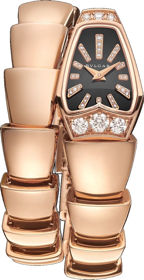 Đồng hồ trang sức Serpenti với bộ chuyển động thạch anh, vỏ cong bằng vàng hồng 26 mm 18 kt đính kim cương cắt sáng chói, mặt số bằng pha lê sapphire màu đen, cọc số kim cương và vòng đeo tay xoắn ốc đơn bằng vàng hồng 18 kt.