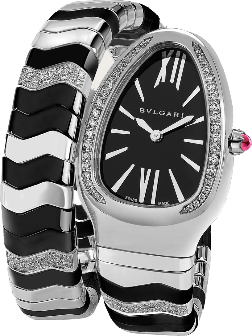 Đồng hồ Serpenti Spiga với bộ chuyển động thạch anh, vỏ cong bằng thép không gỉ 35 mm được đính những viên kim cương cắt sáng chói, vương miện bằng thép không gỉ được đính đá rubellite màu hồng cắt cabochon, mặt số sơn mài màu đen và các cọc số chế tác bằng tay, dây đeo bằng thép không gỉ xoắn ốc đơn và dây đeo bằng gốm màu đen rực rỡ. cắt kim cương.