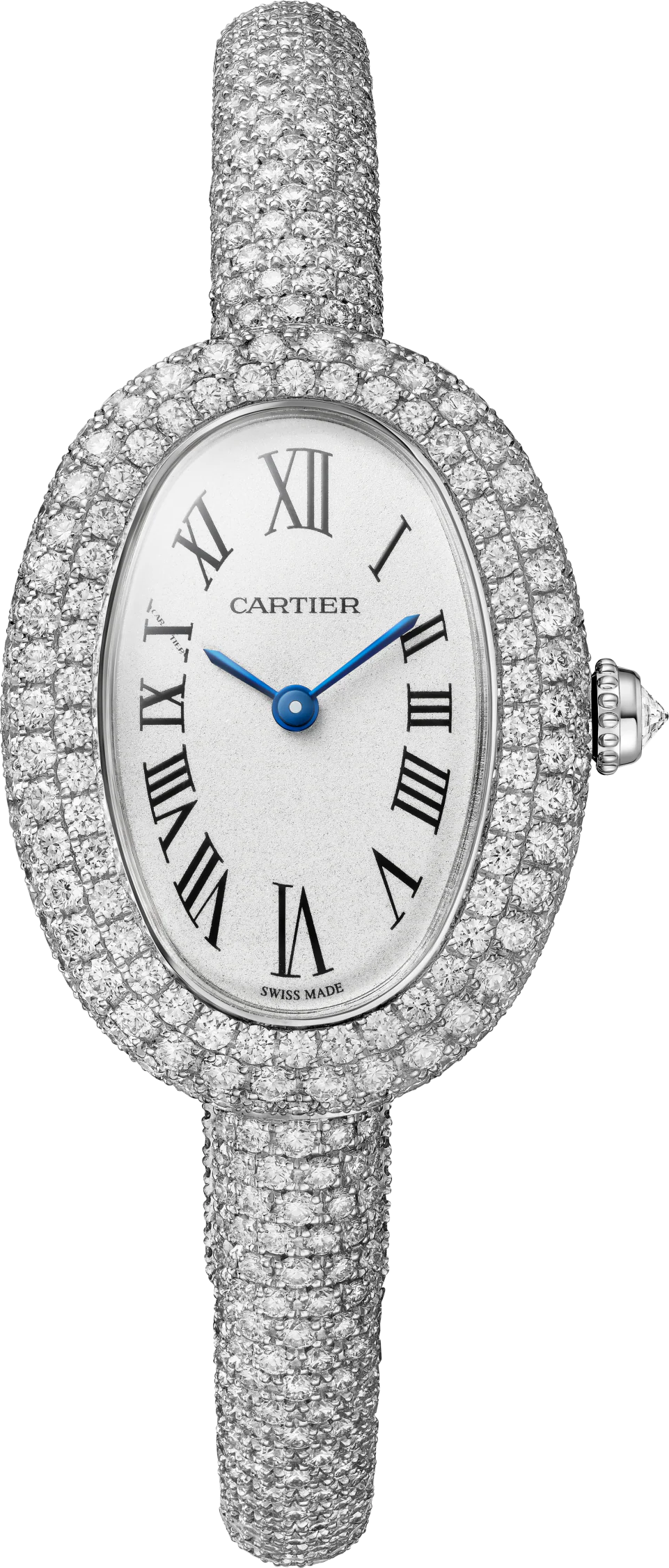 Thiết kế năm 1912 của chiếc đồng hồ sau này được đặt tên là "Baignoire" đã chứng minh được tài năng của Cartier trong việc chế tác hình dáng đồng hồ. Một hình elip thanh lịch được rèn độc đáo trên một đường thẳng duy nhất, đồng hồ "Baignoire" là tinh hoa của phong cách Cartier: sự kết hợp không gì sánh bằng giữa sự thuần khiết và vẻ đẹp vượt thời gian. Đồng hồ Baignoire, mẫu nhỏ, cỡ 15, bộ máy thạch anh. Vỏ bằng vàng trắng 18K hoàn thiện bằng rhodium (750/1000) đính 211 viên kim cương cắt brilliant tổng cộng 2,69 carat. Núm vặn bằng vàng trắng 18K hoàn thiện bằng rhodium (750/1000) đính một viên kim cương cắt brilliant tổng cộng 0,08 carat. Dây đeo cứng bằng vàng trắng 18K hoàn thiện bằng rhodium (750/1000) đính 406 viên kim cương cắt brilliant tổng cộng 3,07 carat. Mặt số hạt bạc, kim hình thanh kiếm bằng thép xanh, mặt kính sapphire. Chiều dài: 31,4 mm, chiều rộng: 23,1 mm, độ dày: 7,3 mm. Khả năng chống nước lên đến 3 bar (khoảng 30 mét/100 feet).