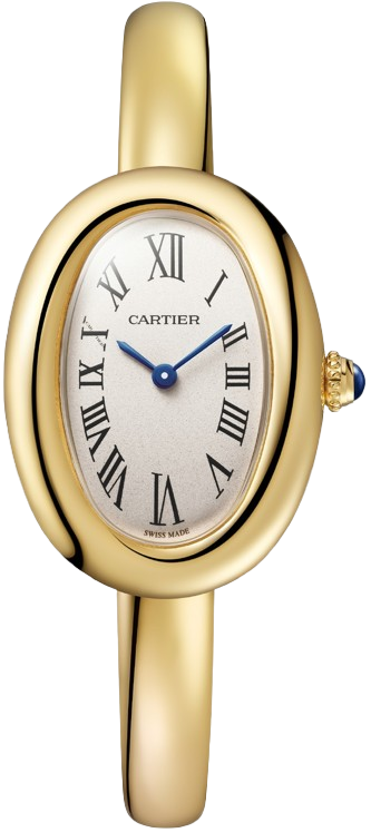 Thiết kế năm 1912 của chiếc đồng hồ sau này được đặt tên là "Baignoire" đã chứng minh tài năng của Cartier trong việc chế tác hình dạng đồng hồ. Một hình elip thanh lịch được rèn độc đáo trên một đường thẳng duy nhất, đồng hồ "Baignoire" là tinh hoa của phong cách Cartier: sự kết hợp không gì sánh bằng giữa sự thuần khiết và vẻ đẹp vượt thời gian. Đồng hồ Baignoire de Cartier. Mẫu nhỏ. Cỡ 17. Bộ máy thạch anh. Vỏ bằng vàng vàng 18K (750/1000). Núm vặn bằng vàng vàng 18K (750/1000) đính hạt đính đá sapphire cabochon. Dây đeo cứng bằng vàng vàng 18K (750/1000). Mặt số mạ bạc. Kim hình thanh kiếm bằng thép xanh. Tinh thể sapphire. Chiều dài: 31,4 mm. Chiều rộng: 23,1 mm. Độ dày: 6,9 mm. Khả năng chống nước lên đến 3 bar (khoảng 30 mét/100 feet).