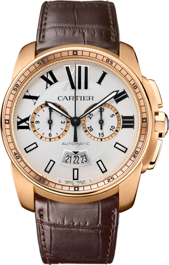 Đồng hồ Calibre de Cartier, 42 mm, Sản xuất bộ máy cơ tự lên dây Calibre 1904-CH MC. Vỏ bằng vàng hồng 18K, núm vặn bằng vàng hồng có mặt sapphire, mặt số opaline hình ốc sên một phần được mạ bạc có chữ số XII, vạch chỉ giờ, khẩu độ và bộ đếm được đóng dấu. "Đường ray" bên ngoài, 7 chữ số La Mã và vạch chỉ giờ chuyển màu đen. Kim hình thanh kiếm bằng thép oxy hóa màu đen có lớp phủ phát quang, tinh thể sapphire, dây đeo bằng da cá sấu bán mờ màu nâu sẫm với khóa gập đôi có thể điều chỉnh bằng vàng hồng 18K, đồng hồ bấm giờ, khẩu độ lịch ở vị trí 6 giờ, mặt sau vỏ sapphire, độ dày: 12,6 mm, chịu nước ở áp suất 10 bar (100 mét/330 feet).
