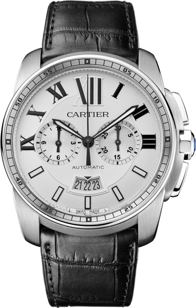 Đồng hồ Calibre de Cartier, 42 mm, Sản xuất bộ máy cơ lên dây tự động cỡ nòng 1904-CH MC. Vỏ thép, núm vặn bằng thép mài giác có mặt Spinel tổng hợp màu xanh lam, mặt số màu bạc đục một phần hình ốc sên có chữ số XII được đóng dấu, vạch chỉ giờ, khẩu độ và bộ đếm. Đường ray bên ngoài, 7 chữ số La Mã chuyển màu đen và vạch chỉ giờ. Kim hình thanh kiếm bằng thép oxy hóa màu đen có lớp phủ phát quang, tinh thể sapphire, dây đeo bằng da cá sấu bán mờ màu đen với khóa thép gấp đôi có thể điều chỉnh, đồng hồ bấm giờ, lịch ngày ở vị trí 6 giờ, mặt sau vỏ sapphire, độ dày: 12,6 mm, nước- chịu được 10 bar (100 mét/330 feet).