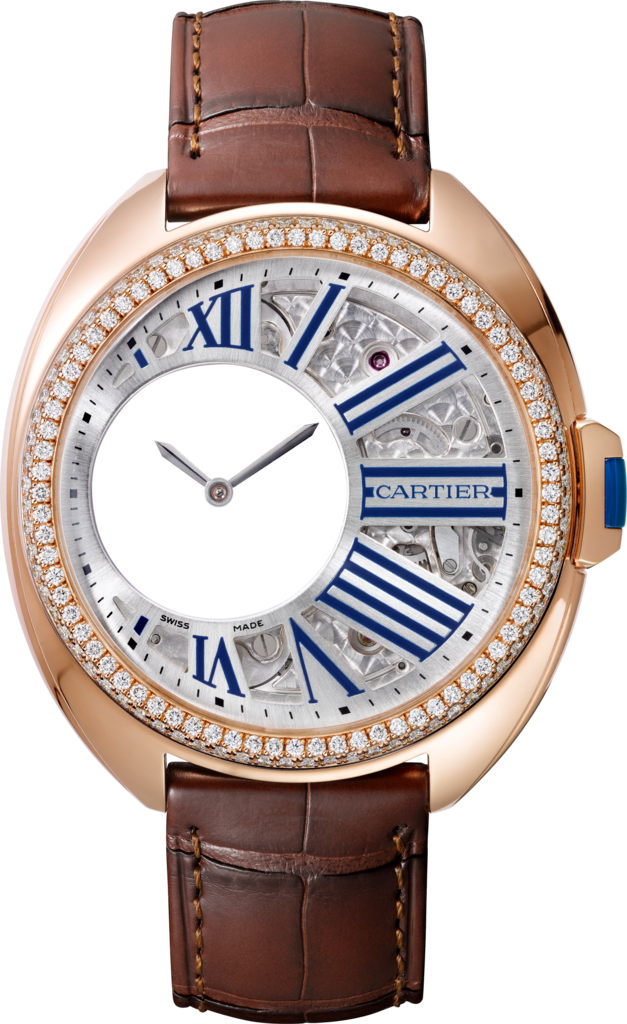 Đồng hồ Clé de Cartier Mysterious Hours, 41 mm, Bộ chuyển động cơ lên dây bằng tay được sản xuất, cỡ nòng 9981 MC. Bộ vỏ bằng vàng hồng 18K với 152 viên kim cương cắt sáng chói có tổng trọng lượng 1,24 carat, bộ chìa khóa bằng vàng hồng 18K với mặt kính sapphire, lưới openwork màu bạc với hiệu ứng tia nắng, kim đồng hồ bằng thép rhodium hình thanh kiếm. Dây đeo bằng da cá sấu màu nâu, bộ khóa đôi bằng vàng hồng 18K có thể gập lại được đính 43 viên kim cương cắt sáng chói tổng cộng 0,43 carat. Biến chứng hiển thị giờ và phút bí ẩn. Bộ máy bao gồm 158 bộ phận trong đó có 27 viên ngọc. Đường kính bộ máy: 31,9 mm, độ dày bộ máy: 4,61 mm, độ cân bằng: 28.800 rung động/giờ, dự trữ năng lượng xấp xỉ. 48 giờ. Mặt kính sapphire và vỏ sau. Độ dày vỏ: 11,25 mm. Chống nước ở áp suất 3 bar (khoảng 30 mét/100 feet).
