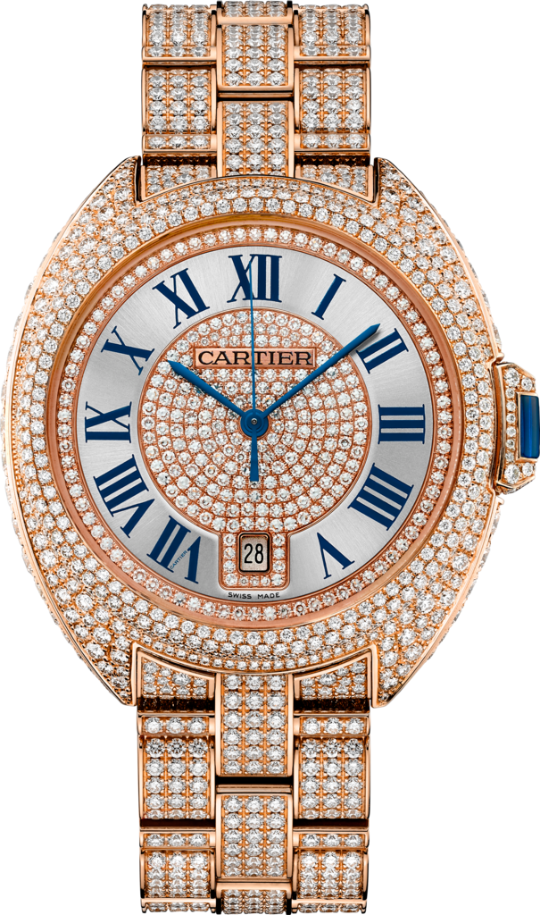 Đồng hồ Clé de Cartier, 40 mm, Sản xuất bộ máy cơ tự lên dây, cỡ nòng 1847 MC. Vỏ bằng vàng hồng 18K đính kim cương cắt sáng chói, đường kính: 40 mm, độ dày: 11,76 mm, bộ chìa khóa bằng sapphire và kim cương cắt sáng chói, mặt số vàng hồng 18K nạm kim cương cắt sáng chói, kim hình thanh kiếm bằng thép xanh , Vòng đeo tay bằng vàng hồng 18K đính kim cương cắt sáng chói, mặt sau vỏ sapphire. Chống nước ở áp suất 3 bar (khoảng 30 mét/100 feet).
