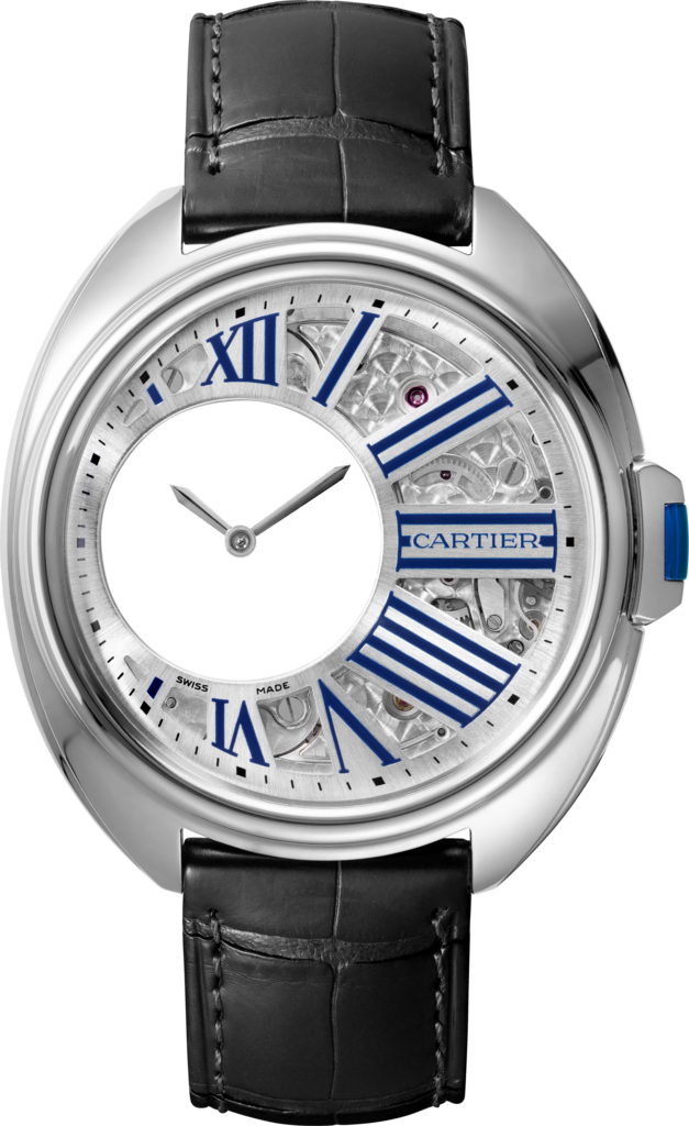 Đồng hồ Clé de Cartier Mysterious Hours, 41 mm, Sản xuất bộ máy cơ lên dây bằng tay, cỡ nòng 9981 MC. Vỏ palađi, bộ chìa khóa palađi bằng sapphire, lưới openwork màu bạc với hiệu ứng tia nắng, kim hình thanh kiếm bằng thép rhodium, dây đeo bằng da cá sấu màu đen, khóa gấp đôi bằng vàng trắng 18K có thể điều chỉnh được. Biến chứng hiển thị giờ và phút bí ẩn. Bộ máy bao gồm 158 bộ phận trong đó có 27 viên ngọc. Đường kính bộ máy: 31,9 mm, độ dày bộ máy: 4,61 mm, độ cân bằng: 28.800 rung động/giờ, dự trữ năng lượng xấp xỉ. 48 giờ. Mặt kính sapphire và vỏ sau. Độ dày vỏ: 11,25 mm. Chống nước ở áp suất 3 bar (khoảng 30 mét / 100 feet).